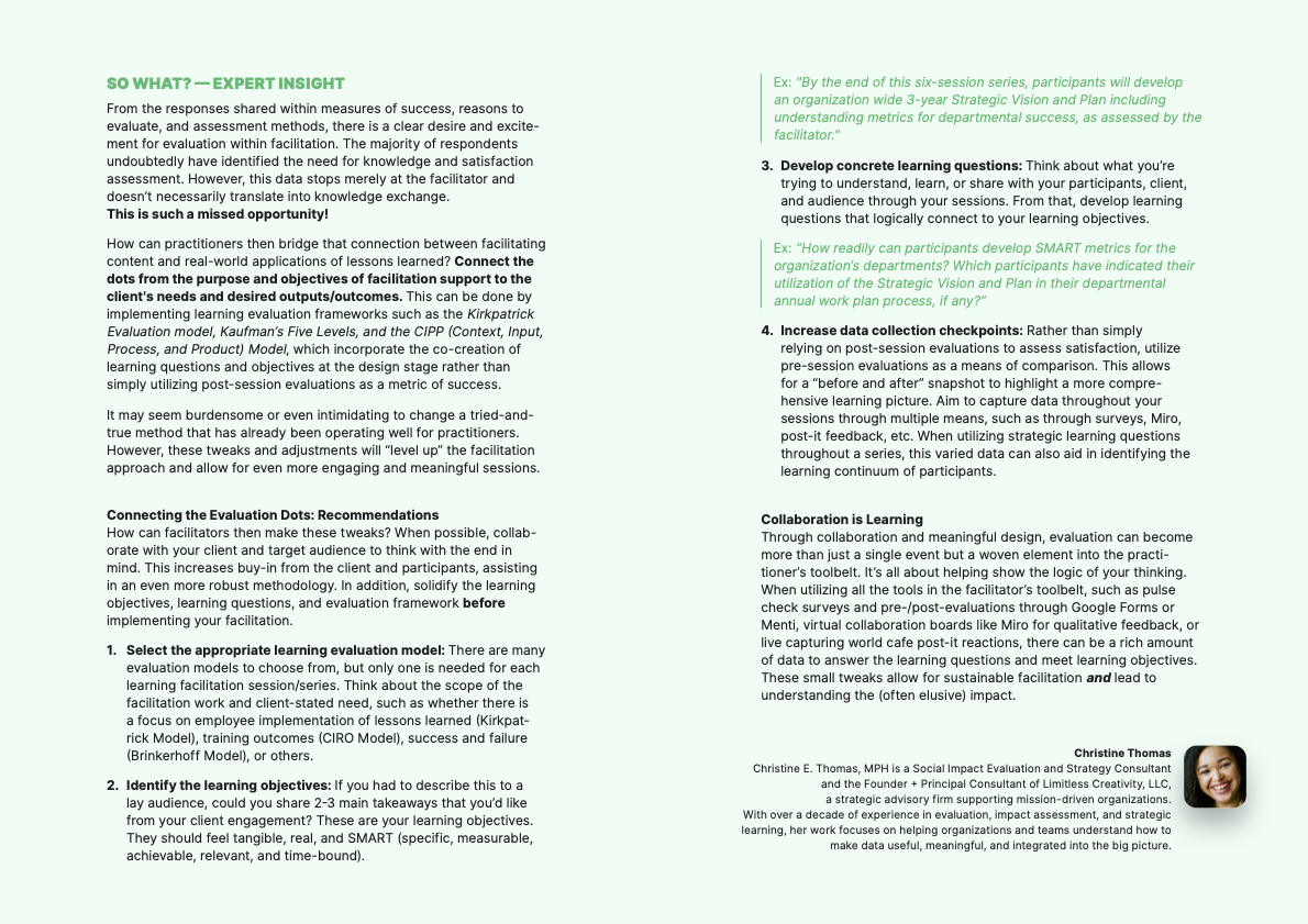 As a featured expert insight for the 2026 SessionLab State of Facilitation Report, Christine provided concrete recommendations on the incorporation of MERL in facilitation, including the utilization of learning evaluation frameworks, learning objectives, learning questions, and data collection checkpoints. This culminated in a launch event where more than 120 facilitators joining for a best practice session on ways they might incorporate these recommendations into their own practice.